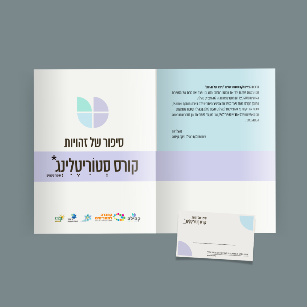 עיצוב מוצרי דפוס עבור קורס "סטוריטלינג – סיפור של זהויות".העיצוב כלל פולדר פתוח, נייר מכתבים, עט, פלאייר הרשמה, תגי משתתפים וגלויות – כולם תחת שפה גרפית אחת.הקו העיצובי נשען על צבעוניות רכה, טיפוגרפיה מודרנית וסימנים גרפיים שמעבירים תחושת קרבה, הקשבה ואישיות – בהתאם לרוח הקורס.